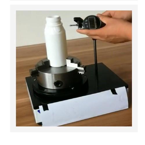 將瓶底加持固定在水平板的旋轉(zhuǎn)盤(pán)上,使瓶口與千分表接觸,旋轉(zhuǎn)360度;讀取大值和小值,二者之差的1/2即為垂直軸偏差數(shù)值。儀器利用三爪自定心卡盤(pán)同心度高的特點(diǎn),配合一套可以自由調(diào)節(jié)高度和方位的高自由度的支架,可以滿足各類(lèi)玻璃瓶及塑料瓶檢測(cè)